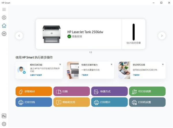 使用方面,支持HPSmart添加打印驱动的惠普LaserJet Tank 2506dw激光打印机,可以为终端用户提供更简单更方便的驱动安装服务,初次安装驱动的用户只需通过USB数据线连接,在HP Smart中选择型号即可完成打印驱动的安装,作为一款支持无线打印操作的惠普LaserJet Tank 2506dw激光打印机,用户还可以在HPSmart中为其设置无线网络便于后续的使用。