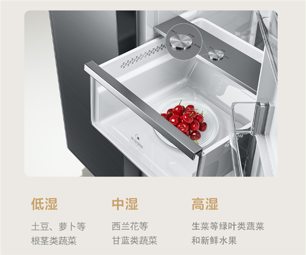 在冷藏室下方特别配备了干湿可调抽屉,高湿环境下能够提供90%相对湿度,适宜储藏叶菜、蔬果,能够保持长效保鲜;低湿环境下湿度低至45%,一些干货、珍品在这种环境不易受潮变质,能够维持较长时间的原味口感。