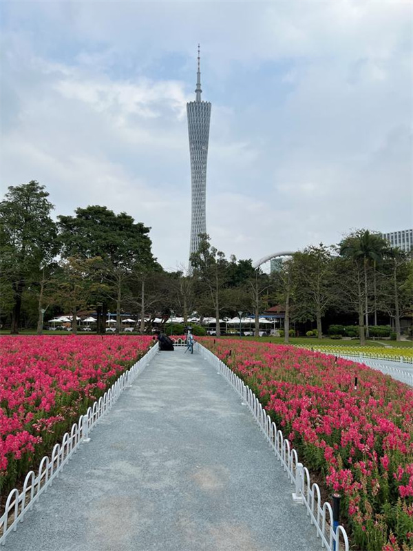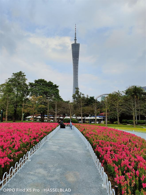 我们又特地去了一趟广州花城广场拍摄了一组样张。从下图可以看到,光线充足的情况下,两者的差距其实并不大,对于广州塔的塔身纹理,以及天空白云、花草树木的细节还原也都非常到位。不过可能是OPPO一贯以来的色彩调教风格导致,OPPO Find X5 Pro拍出的画面看着是要比iPhone 13 Pro,更为浓郁饱满一些,花朵看上去更艳红,树木也更葱翠。