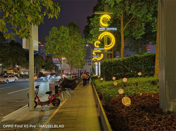 来到夜景环境下,两者则呈现出了不同的成像差距。从我随手拍摄的马路夜景图不难看出,OPPO Find X5 Pro的成像会更纯净一些,路边的招牌也没有出现过曝和泛白的情况,高光压制出色,色彩还原到位,表现不错;iPhone 13 Pro虽然亮度更高,但是画面丧失了不少纯净度和细节度,动态范围明显没有OPPO Find X5 Pro更为出色,甚至大家还可以看到,街道旁边的树木还出现了些许涂抹感,观感还是稍逊。