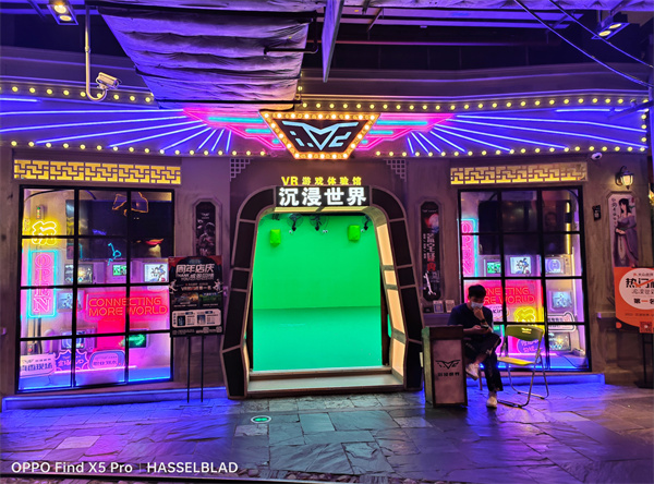 如下图所示,OPPO Find X5 Pro拍摄的画面同样拥有不错的亮度和色彩饱和度,而且对于复杂光源的处理也非常到位,整体明暗过渡自然,层次分明,拥有很高的动态范围表现;iPhone 13 Pro虽然在高光压制部分也表现得不错,但整体画面偏暗,而像图中小哥哥的人物细节,在暗光下甚至出现了涂抹痕迹,细节表现有待提升。