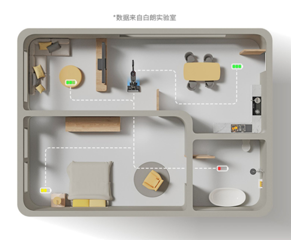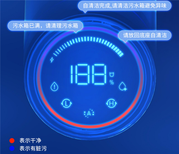 白朗C02除菌洗地机可以智能识别地面的脏污情况,然后自适应调整清洁力,让拖地变得非常轻松。另一个智能化的点就是它能通过屏幕和语音双重提示清洁进程。比如屏幕上的红色圈代表清洁干净了,蓝色圈代表还是脏污情况;滑条式呈现吸力大小,百分比呈现剩余电量……同时也会不停发出类似“自清洁完成,请清洁污水箱避免异味”“请放回底座自清洁”这一类清晰的语音指令,简直就是一个智能化的管家。