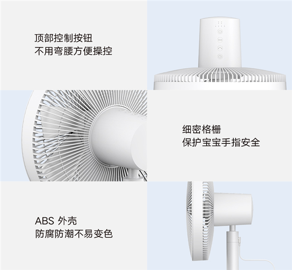 小米米家直流变频落地扇E正面无操作面板,所有指示灯和按钮都布置在了风机顶部。分别是“定时”、“摇头”、“风速”/“风类”、“开关机”,指示灯分别是“1-4档风速”、“Wi-Fi连接”、“自然风模式”。不仅如此,作为米家ASPCMS社区官网居生态链的一员,“米家直流变频落地扇E”同样支持米家APP控制和小爱同学语音控制,不过这块我们后面再说。