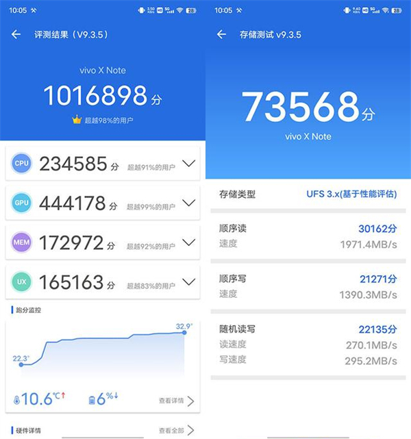 顶级的硬件与散热相结合,最极限的性能释放就是自然的结果了。vivo X Note安兔兔评测随便一跑得分就超过了101万分,存储跑分超过7.3万分,成绩上是毋庸置疑的顶级表现。