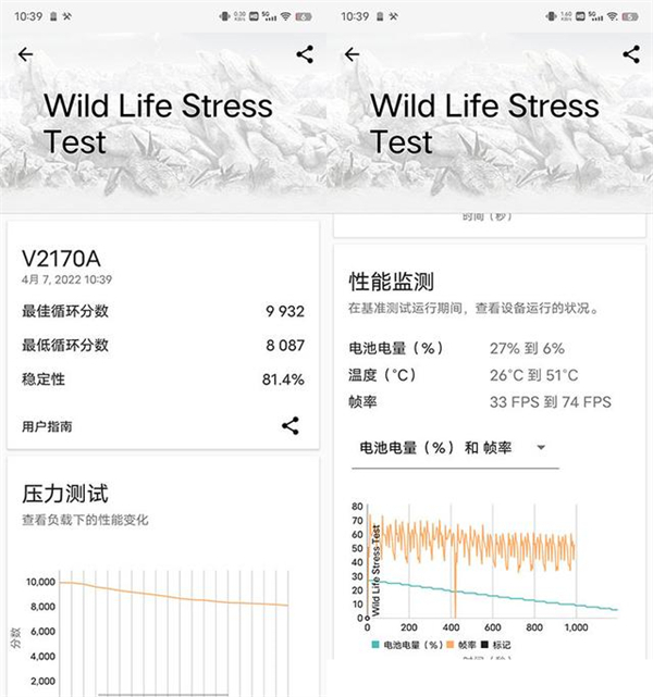 在注重极限性能释放的3DMark测试中,vivo X Note在20次循环测试中,能够获得超过80%的稳定性表现,这个成绩在我们测试过的所有手机中,仅有一款采用主动散热的游戏手机能够达到,并且vivo X Note的电池温度还要低上6度。被动式散热的vivo X Note能够达到如此稳定性,在持久的性能输出上肯定是不用担心了。