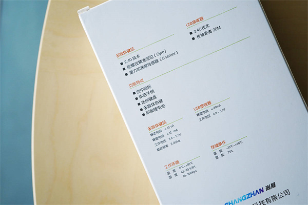 尚展F2S有黑白两款,从包装后面的规格参数能够看到尚展F2S除了采用2.4G的无线传输协议外,还支持6轴高精度数字陀螺仪与重力加速度传感器,可以畅玩体感游戏。