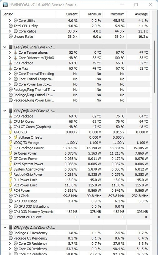先使用AIDA 64系统稳定性测试中的Stress FPU模式进行CPU单烤测试,30分钟后,CPU功耗45W,14个核心温度在66℃-69℃之间,性能核心2.5GHz~2.6GHz,效能核心2.1GHz~2.2GHz。