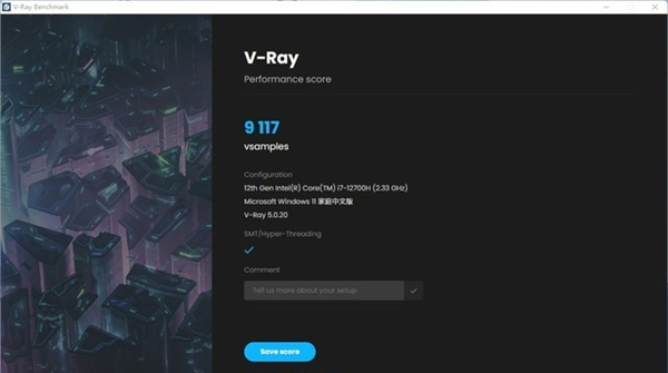 V-Ray是业界内常用到的一款渲染和模拟软件,其官方推出的BenchMark可以用来比对性能表现,在纯的测试CPU物理渲染中,得分9117 vsamples。