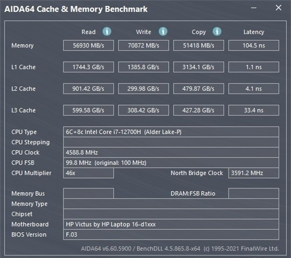 存储方面,光影精灵8全系标配了DDR5内存以及PCIe 4.0的固态硬盘,在这点上值得点赞好评,是目前顶级的存储规格,速度方面有了极为可观的提升,双通道2*8GB的DDR5 4800MHz的高频率内存,读取速度可达56930MB/S,写入速度可达70872MB/S,拷贝速度51418MB/S,延迟104.5ns,速度的提升可不是一星半点的。