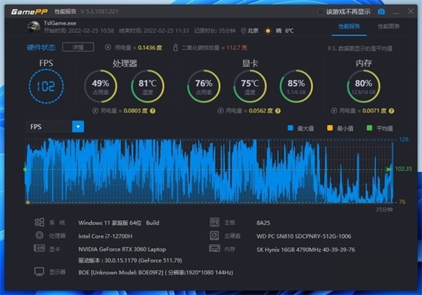 首先是游戏测试,在《PUBG》中,选择1080P分辨率+预设最高画质,关闭垂直同步,在海岛地图中进行一把4排游戏,填充队友,死后观看直到游戏决出胜者,整局游戏的平均帧数为102帧。