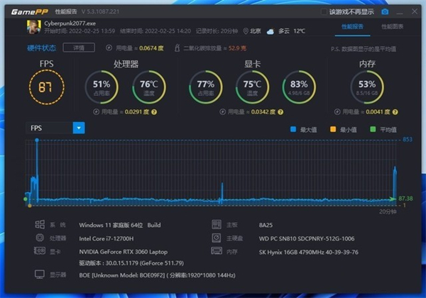 在《赛博朋克2077》中,选择预设画质的“高”,1080P分辨率,关闭垂直同步,20分钟的游戏过程中,平均帧数为87帧。