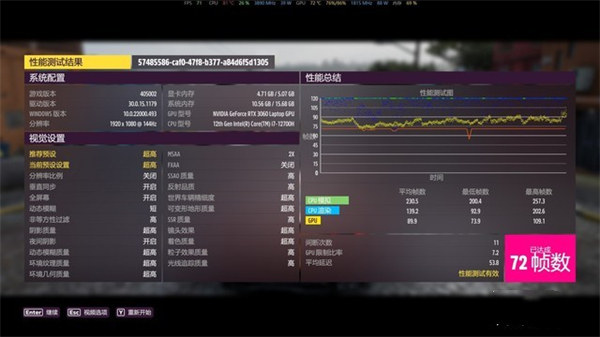 在《地平线5》中,选择预设的“极致”画质,1080P分辨率,关闭垂直同步,运行游戏内置的BenchMark,平均帧数为82帧。