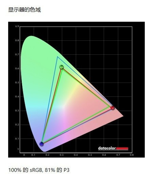 实测这块屏幕覆盖100%sRGB、81%P3色域;最大亮度383.6尼特,对比度可以达到1050:1;色彩精确度平均值为1.97.屏幕素质属于目前的主流水准,可以满足游戏玩家的需要。