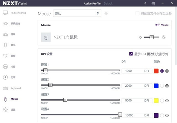 和键盘更加着重于灯效调节不同,NZXT恩杰Lift RGB鼠标更加注重DPI数值的设定,并且能够通过设置,将不同数值的DPI和灯光指示灯进行绑定,让用户通过颜色即能判断不同的DPI数值,并进行一键调整。