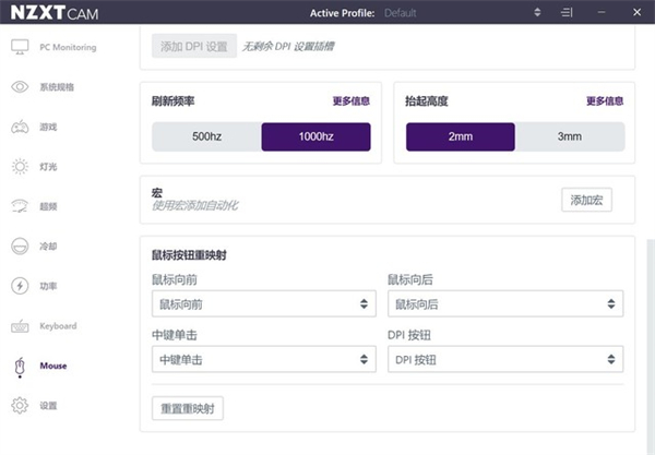 此外,用户能通过该页面,进行鼠标刷新率、抬起高度等固定数值进行切换;更为重要的是,用户还能通过按钮重映射功能,自定义鼠标上4个按键的功能,打造属于自己的个性化鼠标。
