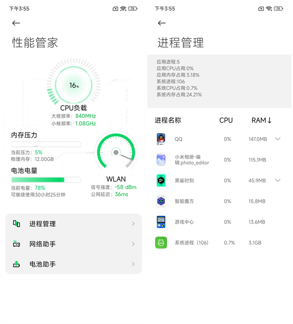 性能管家顾名思义,可以实时查看CPU负载,以及内存、网络的数据,通过进程管理查看后台运行的任务,以对系统有着更清晰的了解,其实个人觉得用处不大,后续可以加入手动调节CPU核心,增加可玩性。