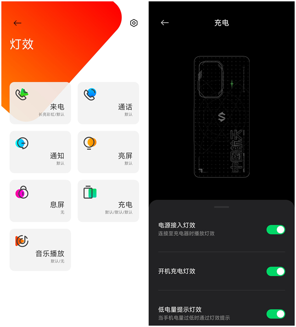灯效方面,机身后置的灯效可以自定义调节颜色或某个场景,当作呼吸灯使用,同时增加辨识度。