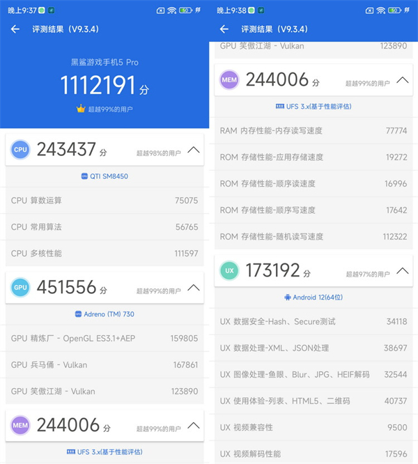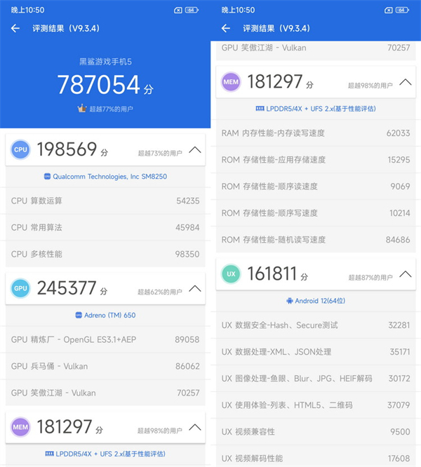 然后来看黑鲨5 Pro,CPU和GPU成绩属于骁龙8 Gen1的正常表现,调度要比常规骁龙8 Gen1机型好一些,但是存储成绩领先众多Android手机,原因在于SSD+UFS 3.1闪存的优势,这种另辟蹊径的方案极大提升了手机存储能力,相比传统闪存,固态SSD确实有奇效。