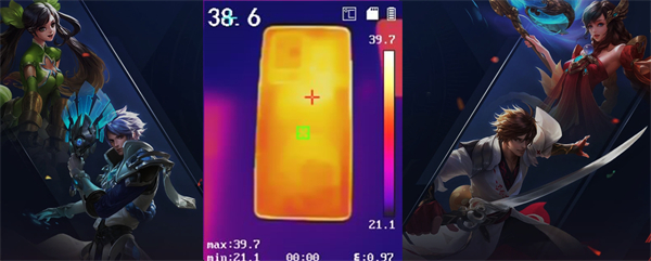 另外根据温度显示,黑鲨5 Pro机身后盖热量分布均匀,整个后盖没有温度特别高的位置,主要原因是散热材料充足,VC液冷散热流通更快,导热也就更快。