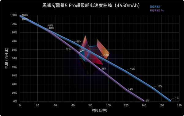 在超级耗电测试下,搭载骁龙870的黑鲨5坚持了170分钟,搭载骁龙8 Gen1的黑鲨5 Pro为140分钟,两者同等电池容量,主要差距就在于屏幕和处理器功耗,后者应该占一大部分原因。