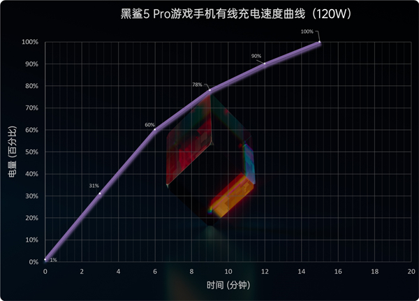 黑鲨5和黑鲨5 Pro电池容量、充电功率一致,得出结果是15分钟充满,其中6分钟充入59%电量,9分钟就已经充入89%,速度要比常规120W快充机型更快一些。