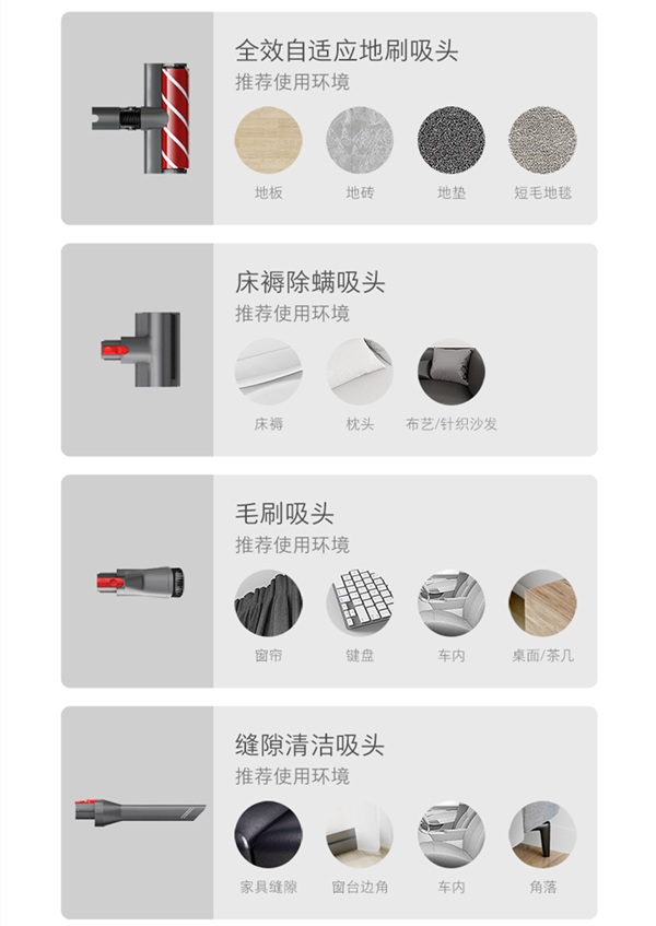 无论是在地毯、硬质地板还是在墙壁边缘,石头无线吸尘器H6都能够有效吸入颗粒与微尘,表现非常地到位,家里如果拥有石头H6无线吸尘器的话,相信搭配如此丰富的刷头配件,清洁的需求应该都能够一一满足。
