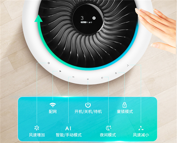 LIFAairLA-Y300离子体空气消毒机的功能键集成在顶部一圈,呈环形分布。从左至右依次为风速加、消毒模式、AI模式、夜间模式、开关键、WiFi配网功能、3G滤芯/滤网寿命查看、童锁开关和风速减。从设计的角度出发,LIFAair几乎已将简洁发挥到了极致。