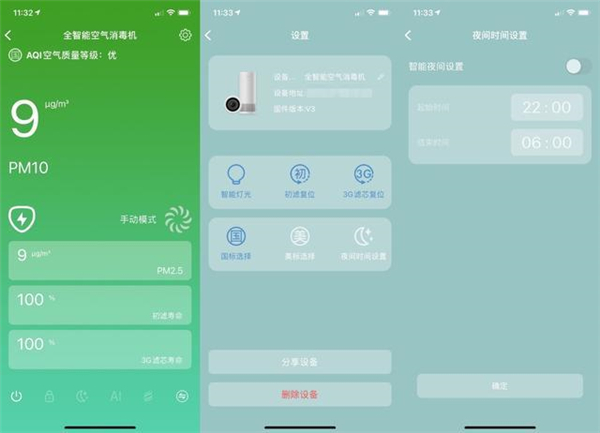 在设置界面中,我们还可以对LIFAairLA-Y300离子体空气消毒机的屏显灯光、夜间模式开启时间、滤芯的复位等进行控制。在显示屏上出现的空气质量标准是以国标还是美标为准,也是通过LIFAair APP切换。两者的区别在于,在国标下的AQI空气质量等级为优时,美标可能只是良。所以在美标模式下,机器会更强力地工作,夜间也会更响一些。