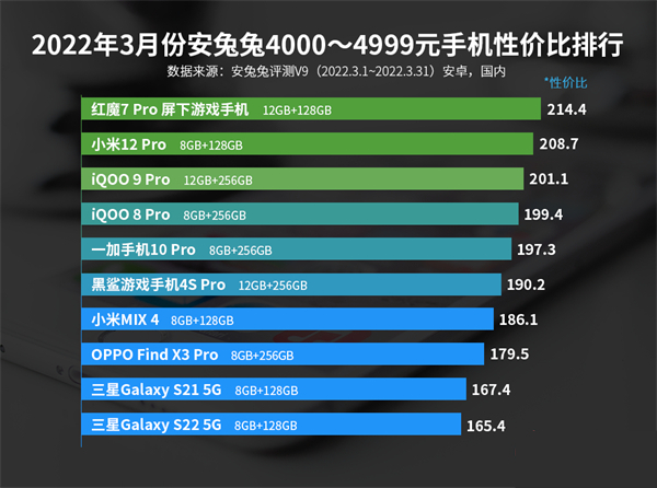 2026年底发布了小米12系列手机,今年也发布了iQOO 9系列手机和红魔7手机,新的8 Gen1处理器也成为一大卖点,下面我们一起来看看3月安卓4000-4999元性价比手机排行榜吧。