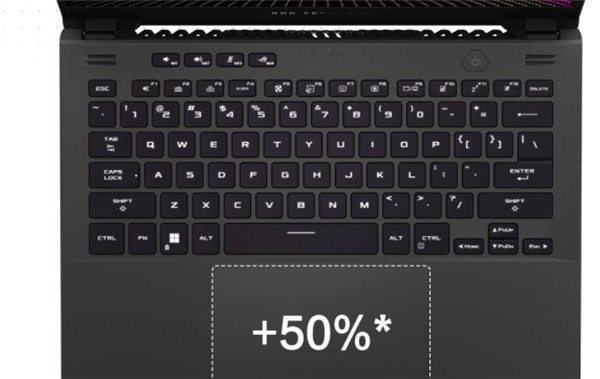 键盘方面ROG幻14 2022款键盘手感依旧保持了系列高水准,键帽间距约1.68mm,宽度适中,可有效避免误触。1.5mm键程略微偏短,因此拥有更快的触发速度。并且其键盘采用了静音设计,大力度敲击时,其噪音也会控制在30dB以下。同时为了方便内容创作者和游戏玩家,它采用了全键无冲突设计。而在暗光环境下,ROG幻14 2022款提供了三档亮度的白色背光。