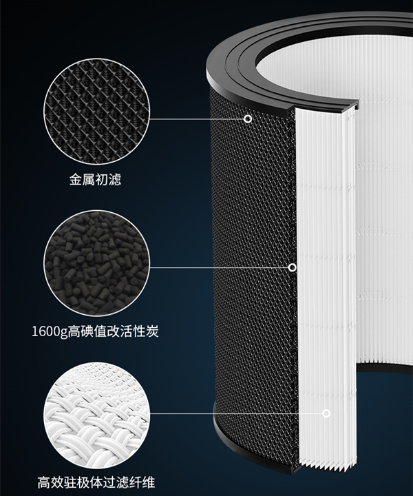 这种滤芯的活性炭层使用的是特殊配比高碘值改性活性炭,具有亿万纳米级孔隙结构,1.6kg就拥有相当于94个足球场大的体表面积。相比普通活性碳净化效率更高,它通过吸附+分解+固化的方式来净化空气中的甲醛、TVOC等有害气体。