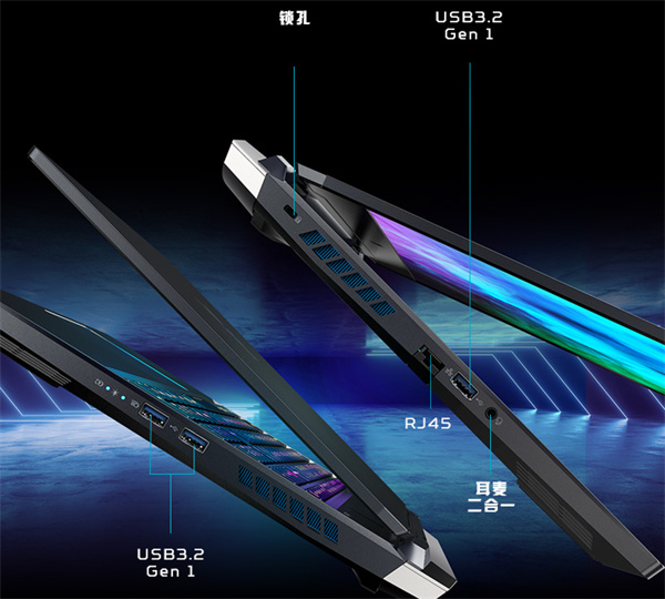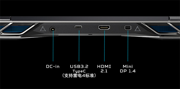 机身左侧依次为一个RJ45网线接口、1个USB 3.2接口、1个耳机/麦克风插口;机身右侧设计有2个USB 3.2接口(支持关机充电);机身后部配置了电源接口、雷电4接口、HDMI接口和MiniDP接口。