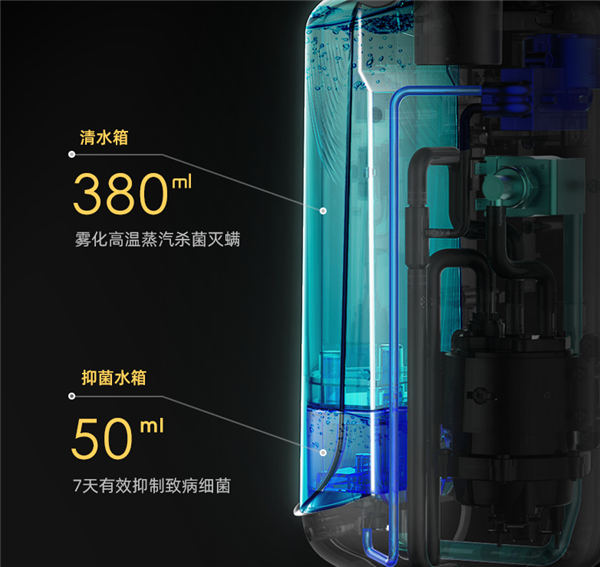 大宇抑菌蒸汽拖把的水箱分上下双仓结构。上面的蒸汽水箱380ml,大容量可拆卸水箱,一次加水,可以完成120㎡的清洁面积,还是比较省心省力的。不用二次灌水比较方便。下仓50ml抑菌液仓,灌注附送抑菌液。