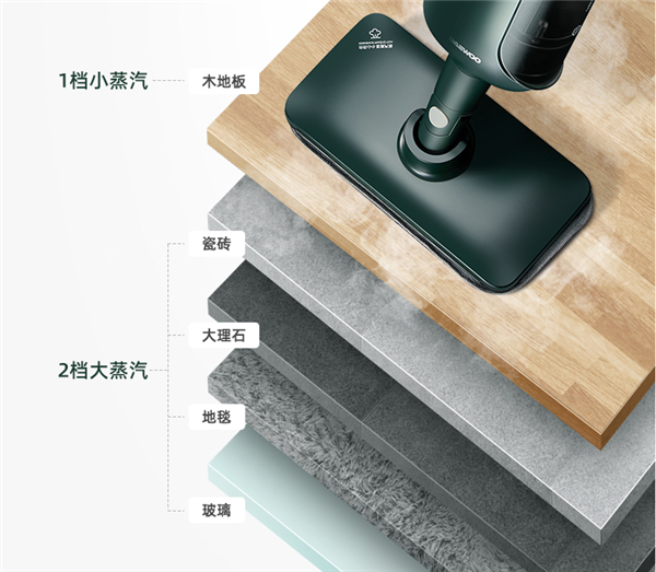 2档大蒸汽针对地砖、地毯等耐高温材质地面,强效清洁,有效消毒杀菌。清洁液有单独的触摸键,可单击选择加还是不加。