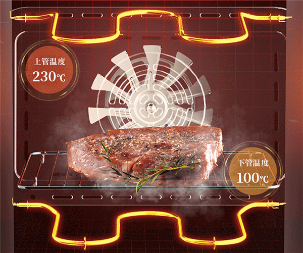 在工作过程中,内置电机带动循环风扇,就可以将蒸烤炸箱内部热量均匀的分布到每一个角落。在内腔右侧上下加热管部位分别各设计了一个独立NTC探头,这两个NTC探头能够做到±5℃的精准控温,从而实现上下加热管更加精准的独立控温,可以将食材的表面烤出更加均匀的色泽。