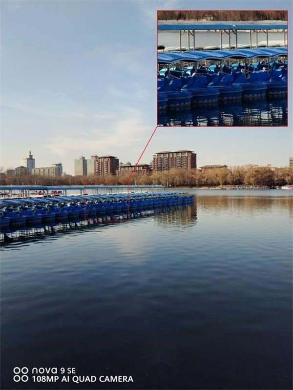 这张照片就是通过高像素模式拍摄的,照片整体还是十分清晰的,即便将画面中心图像区域放大3倍后,依旧可以获得一张高质量裁剪照。可以看到,放大后的样张依旧有足够细腻的细节,水面倒影、船身纹理都清晰可见。