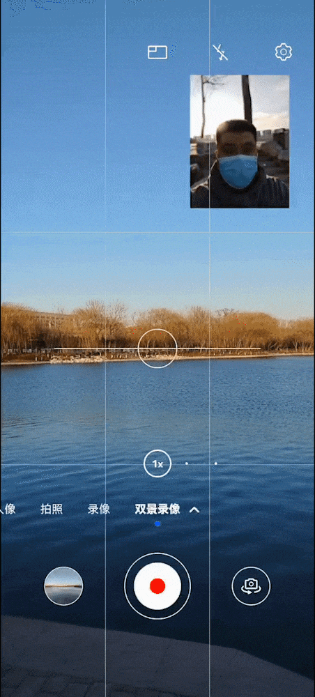 甚至还支持前后双镜画中画同录,其中任意一个镜头的景别都能以画中画形式呈现主取景画面之上,并且可以任意切换,切换过程顺滑自然,不会中断拍摄过程。