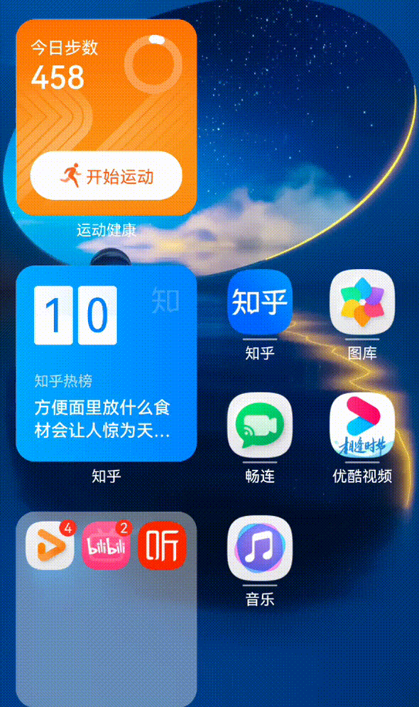 与此同时,这些服务卡片同样支持多种形态定制,并且当用户图标上滑呼出服务卡片后,也可以通过点击卡片右上角的“书钉”按钮将其发送至桌面,就可以通过搭配不同APP的万能卡片,随心布置自己喜欢的桌面风格。