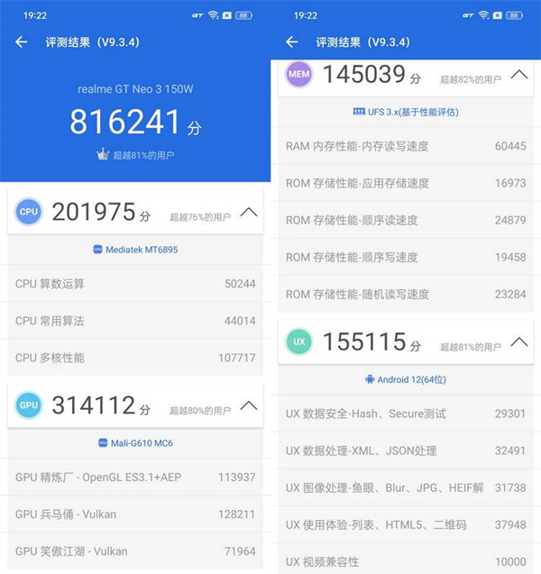 最后在安兔兔评测的综合测试中,我们手头这台12+256GB的真我GT Neo3.很轻松地就在常温环境跑出了81万以上的综合成绩,这基本已经快追平了去年旗舰主控骁龙888的表现。从这一点也不难看出,天玑8100此次的性能进步是真的很大。