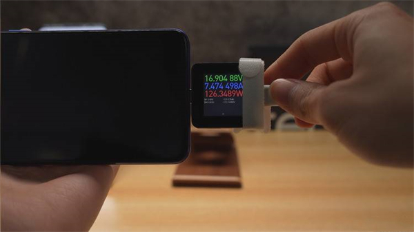 然后插上包装盒里自带的150W充电头,开始充电。可以看到在充电开始阶段,记录仪能够监测到126W到130W的瞬时功率输入。