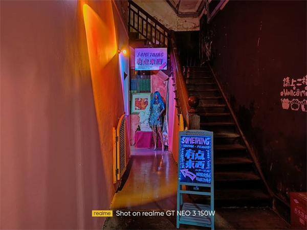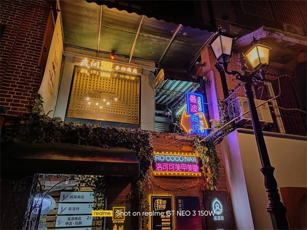而在夜景方面,真我GT Neo3此次也有着较大幅度的升级。据官方透露,其配备了自研的“ProLight 超感光技术”,而从我们的实测结果来看,它的夜景模式调校还是更偏向城市夜景的,也就是说会更注重对于光源的过曝抑制,而非纯黑环境下的“暴力”提亮。其实这很合理,毕竟真我GT Neo3整机的设计都是为了让年轻人觉得“好玩”,拍好这类用户常去的场景才是它的“本分”。