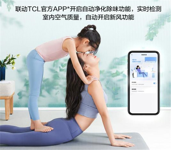 联动TCL官方APP*开启自动净化除味功能,实时检测室内空气质量,当室内空气3分钟持续出现TVOC> 3mg时,自动开启新风功能, 高效增氧循环空气,Tvoc值< 3mg/m3时,净化完成自动降低新风。