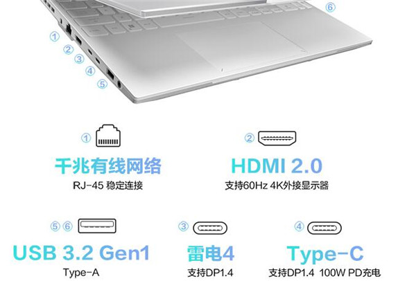 双C口配置,搭载1雷电4接口,即使外出使用PD充电的同时,也可用另一个C口外接大容量硬盘进行剪辑和大文件高速传输。