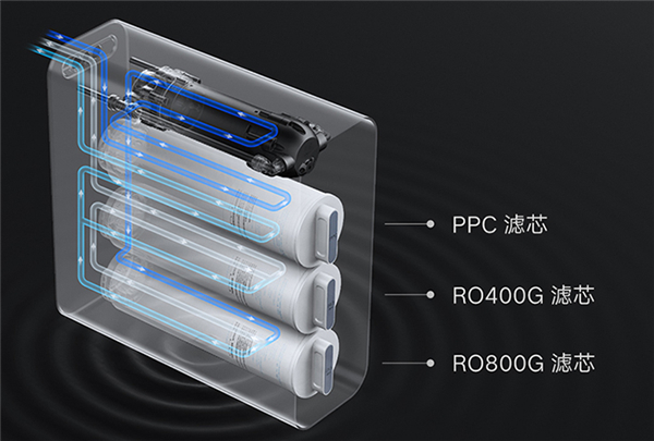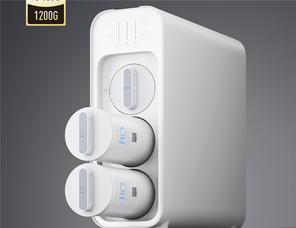 得益于双RO过滤系统的优势,利用副膜保护主膜,主膜不易堵塞,出水量不衰减,更换周期更长。为什么要选用800G+400G滤芯方案,而不是单只1200G?出水流速更稳定:得益于双RO过滤系统的优势,主副RO滤芯同时过滤出纯水,双芯过滤,达到更大净水量。