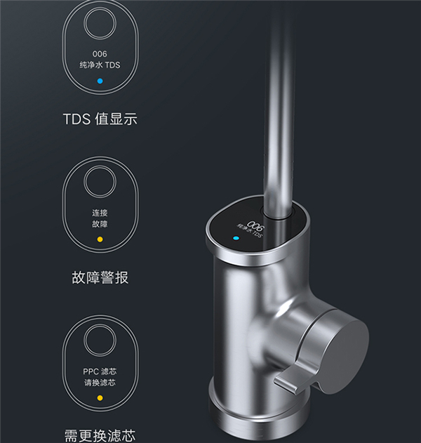 小米净水器1200G一大亮点是可以在水龙头的LED显示屏上直接显示纯水的TDS值,并且这块屏幕同时也是更换滤芯和错误代码的显示屏。面板的部分同样非常直观,三条灯带直接显示三个滤芯的使用状态。