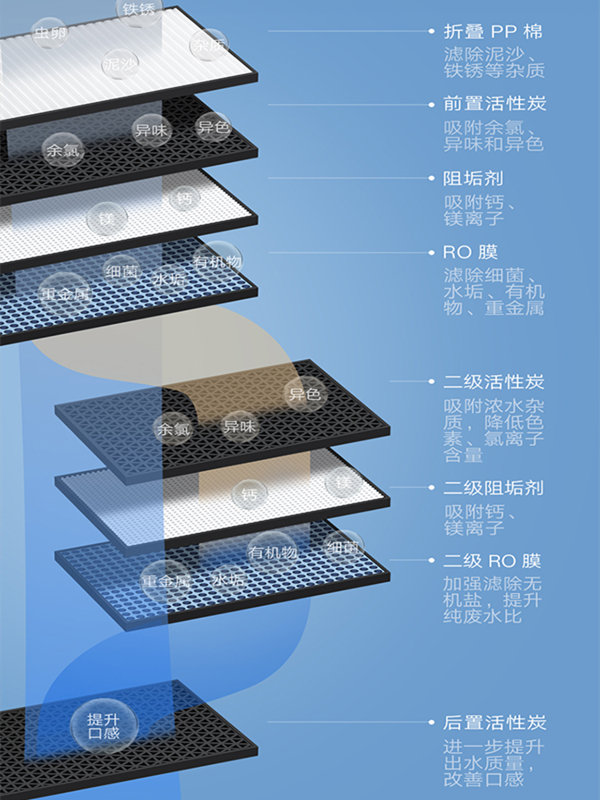 小米净水器1200G通过折叠 PP棉滤除泥沙、铁锈等杂质。通过前置活性炭吸附余氯异味和异色。通过阻垢剂吸附钙镁离子。通过RO 膜滤除细菌水垢、有机物、重金属。通过二级活性炭吸附浓水杂质,降低色素、氯离子含量。通过二级阻垢剂吸附钙、镁离子。通过二级 RO 膜加强滤除无机盐,提升纯废水比。通过以上8级深层精滤,有效滤除细菌、重金属、消毒产物等有害物质,深层净化每一滴水,达到直接饮用的水质要求。