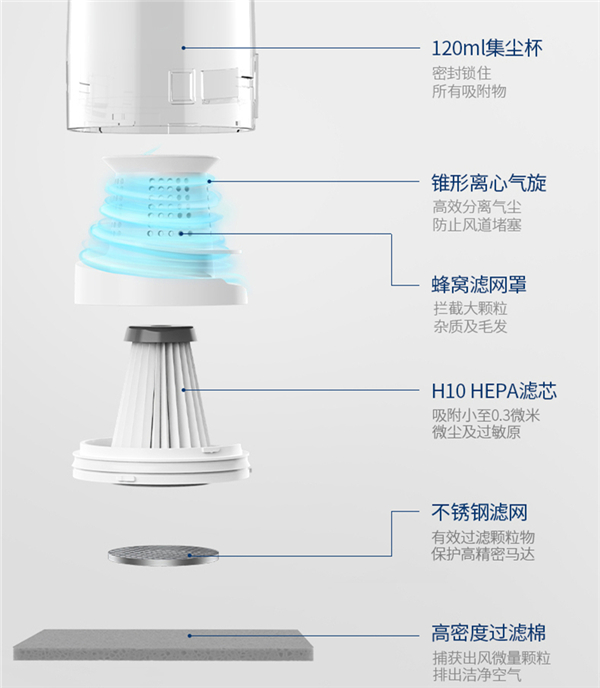 第五、采用H10级六层过滤,99%吸附小至0.3微米看不见的颗粒物,可以直接将粉尘锁于尘盒,减少二次污染。