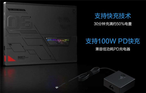 ROG幻X支持56Wh大容量电池,支持快充技术,30分钟充满约50%电量,支持1 00W PD快充,兼容低功耗PD充电器。