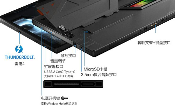 接口丰富,其机身右侧靠上位置设计有电源键和音量调节键,下方设计有USB TYPE-A接口和3.5mm音频插孔。左侧配有一枚Thunderbolt 4接口,支持40Gbps高速传输,支持4K/8K视频扩展等功能。左侧下方接口较为特殊,靠下位置是一枚USB 3.2 Gen 2 TYPE-C接口,融合了DP1.4和PD充电功能。上方是特制的专用显卡扩展坞接口,可支持RTX 3080笔记本电脑GPU扩展,进一步提升图形性能。此外在支架下方,还隐藏了一个MicroSD卡插槽。