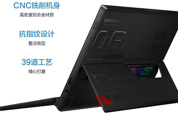 在外观设计上,ROG幻X融合了复古未来主义风格,这种全新的设计灵感源自 20 世纪的太空竞赛,同时在整机的风格打造上将 ROG “终极便携性”的追求发挥得淋漓尽致。背盖后部的 CNC 铣削窗口可以直视机器内部组件,配以可调节RGB光效,整体外观充满科技未来感。内置的支架最多可打开 170 度,在任何情况下都能带来最佳的使用角度。